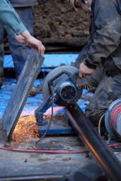 | 車道に面しているライフラインから教会側に引き込むための塩ビ管をカットしているところ。火花が散っています。 | |