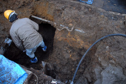 | 入口付近にこのような大きな穴を掘り、慎重に配管工事を進めていきます。 | |