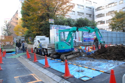 | 上と右の写真は敷地入口付近をパワーショベルで堀り、道路側を通っているライフラインからの引き込み工事をしているところです。 | |