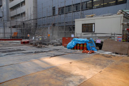 これからいよいよ地上部分の建設が始まるわけですが、そのための準備段階として、敷地全面に鉄板を敷きつめ、重機が乗り入れても1F部分のコンクリートが傷つかないようにしています。