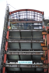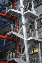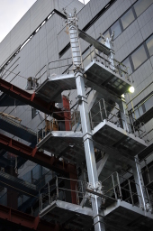 | さび防止のためでしょうか。非常階段は綺麗に銀メッキされており、工事関係者の方もこの階段を使って上り下りされているようでした。 | |