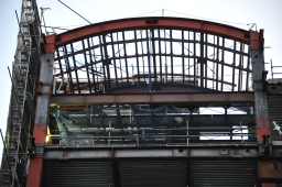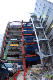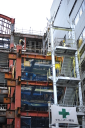 | 年が明け、今週からまた作業が再開しました。この日は新年の作業4日目でしたが、早くも鉄骨の組み立てと同時に非常階段が途中まで取り付けられていました。 | |