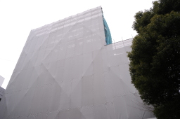 | お気付きでしたでしょうか? 現場の入口がグレードアップし、上には落下物から通行人を守るための防護板も取り付けられました。 |