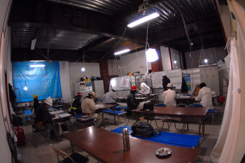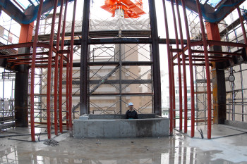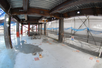 | こちらは教会よりも一足早めに作業が進んでいる福祉施設のフロア。ALC(外壁)も取り付けられ、天井には空調なども取り付けられていました。 | |