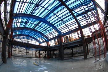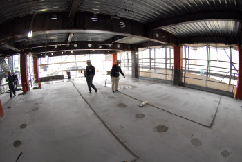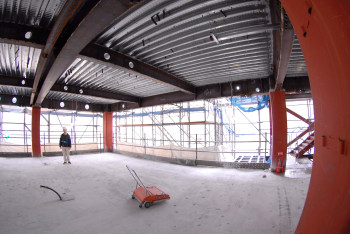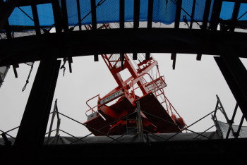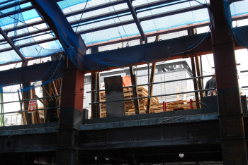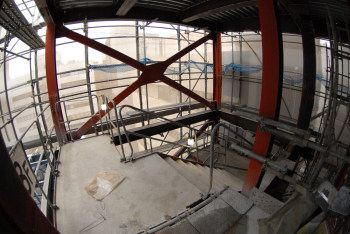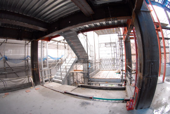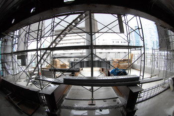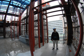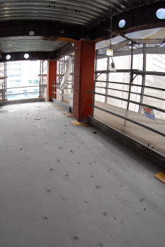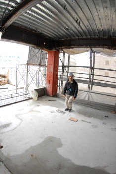 | こちらは6Fテラスへの出入り口となる部分。今はタワークレーンが設置されているため、その土台となっている大きな鉄骨が場所を取っていました。 | |