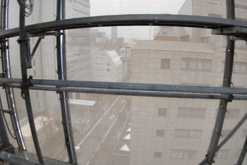 | まずは通りに面して設置されている工事用仮設エレベーターで8Fまで行き、そこから階段で1フロアずつ降りてくることになりました。 この写真はそのエレベーター内から天井を見上げたところです。 |