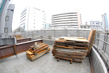 | 6Fテラスに出たところ。今はタワークレーンや資材などが置かれているため余計に狭く感じてしまいますが、ここには部分的に屋上緑化が施されることになります。 | |
