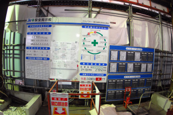 | 1F駐車場部分の壁にはこのような建築の進行状況や安全確認などのボードが設置されています。画面右側にあるのは「KYボード」と言って「危険予測」のための表示がされています。 最近高校生の間で使われている所謂KYは「空気読めない」という意味ですが、こちらのKYはずっと前から使われていた専門用語だそうで、監督さん曰く「現場の空気が読めないと危険は予測出来ないんですよね」とのこと。 どちらのKYもその意味するところは同じなのかも知れませんね。 |