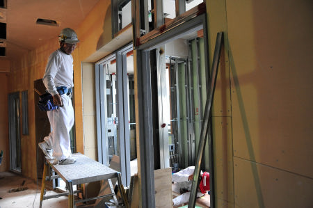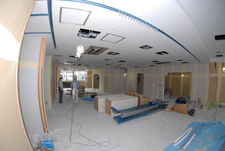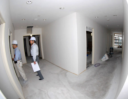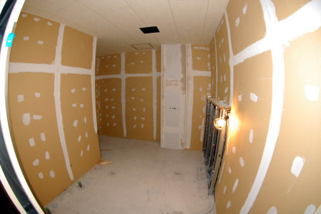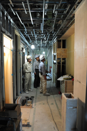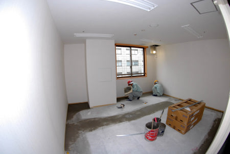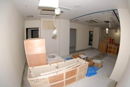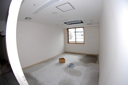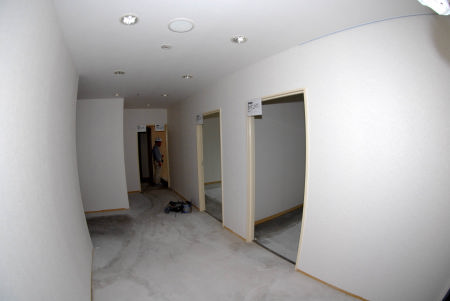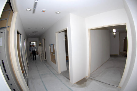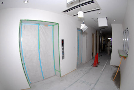 | 8Fエレベーターを降りてすぐ左側を見るとこのように廊下が広がっています。右側の壁には週報BOXなどが取り付けられる予定です。 | |