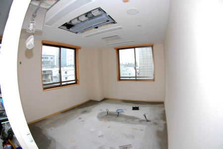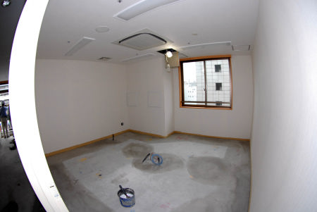| 7Fの部屋を中央(廊下側)付近から見た全景。 写真右側から小礼拝堂、集会室(中央)と続き、左側にはキッチンの入口が見えています。 |