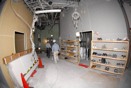 | この日は建物の中に入る前に上履きの代用として靴の上から白いカバーを装着し、内装を見学させていただきました。 | |