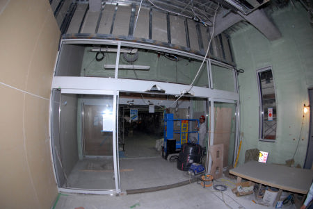 | 教会玄関付近から外側を見たところ。天井工事のため足場が組まれています。 | |